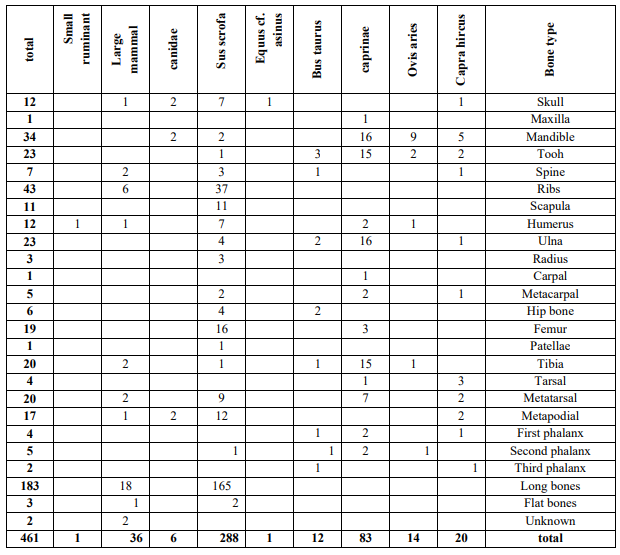 The total 461 pieces of bone weighing 2,845 grams were recovered in the first session of excavation at this site and transferred to the Bio-Archaeological Laboratory of the University of Tehran. The collection of animal remains was obtained in two stratigraphic trenches. Trench T.S.1 started with contexts from number 100 and trench T.S.2 started from number 200. Most bones, with 330 pieces, were obtained from context 103 in trench T.S.1. Contexts 121 and 124 in the same trench contained 31 to 48 bone fragments, respectively. Such a distribution is related to the nature of these contexts (Table 1).