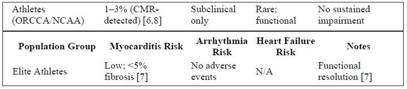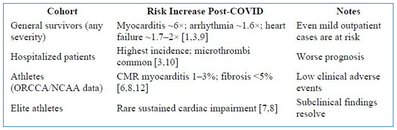 Results COVID-19 survivors face elevated risks of myocarditis (~6×), arrhythmias (~1.6×), and heart failure (1.7–2×) even after mild disease [1-3]. Endothelial dysfunction, microthrombi, direct myocardial injury, and inflammation underpin these sequelae [3-5]. CMR studies in athletes show low prevalence of clinically relevant myocarditis (~1–3%), with subclinical fibrosis in a minority [6-8].