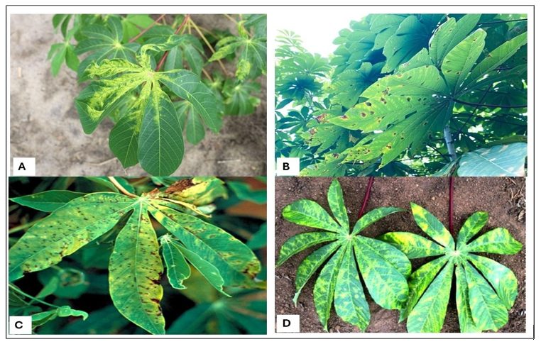 Figure 1: Symptoms of Major Cassava Diseases. (A) Cassava Mosaic Disease Symptoms [73]. (B) Cassava Anthracnose Disease Symptoms (C) Cassava Bacterial Blight Symptoms [74,75]. (D) Cassava Brown Streak Disease Symptoms [69-72,76