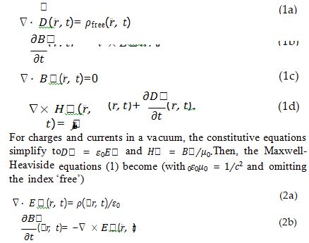 In standard notation and SI units, the Maxwell-Heaviside equations read (SI units; cf. [2,3].)