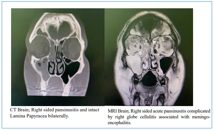 A 42-year-old gentleman, previously healthy, presented to the emergency department with a 1-day history of frontal headache associated with severe right eye pain, redness, and ptosis. On physical examination, he was conscious, alert, and fully oriented. Fever was documented at the time of the exam, while other vital signs were within normal range. He had severe right eye pain, periorbital swelling, and red conjunctiva. There was complete ptosis, proptosis, and restriction of right eye movement (3rd, 4th, and 6th cranial nerves partially affected). The facial sensation was intact, and meningeal signs were negative. Laboratory studies showed leukocytosis of 19.8x109 /L with a neutrophilic predominance of 75.3%, a hemoglobin level of 160 g/L, C- reactive protein (CRP) of 160 mg/L (reference range 0-8 mg/L), creatinine level of 117umol/L, sodium of 134 mmol/L and potassium of 4,42 mmol/L. Then, the patient was admitted for further evaluation, and empirical parenteral antibiotics (Ceftriaxone and Clindamycin) were initiated along with intravenous fluids and anticoagulant therapy (Subcutaneous Enoxaparin). Blood and urine cultures were obtained. CT Head was done and showed mucosal thickening of all visualized paranasal sinuses associated with an air-fluid level in both frontal and right maxillary sinuses.