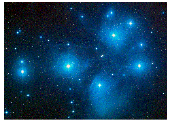Figure 1: Composite wide-field astronomical image of the Pleiades star cluster (Messier 45), showing major stars surrounded by nebulous reflection clouds. The seven brightest stars—Alcyone, Maia, Electra, Merope, Taygeta, Celaeno, and Sterope—are visible at center. The image captures high-energy blue starlight reflecting off interstellar dust. Image courtesy of NASA/ESA Digital Sky Survey.