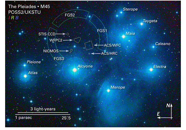 Figure 2: The Pleiades star cluster (M45) with principal stars and Hubble Space Telescope (HST) Fine Guidance Sensor fields overlaid. This image includes the seven major stars of the Pleiades—Alcyone, Maia, Electra, Merope, Taygeta, Sterope, and Celaeno—alongside Atlas and Pleione. Field positions correspond to HST proposals 8335 and 8777. Instruments: HST > FGS, NICMOS, WFPC2, ACS/ HRC, and STIS CCD. Image based on the Second Palomar Observatory Sky Survey (POSS2/UKSTU), filters B, R, and I. Credit: D. Soderblom and E. Nelan (STScI), F. Benedict and B. Arthur (U. Texas), and B. Jones (Lick Observatory).
