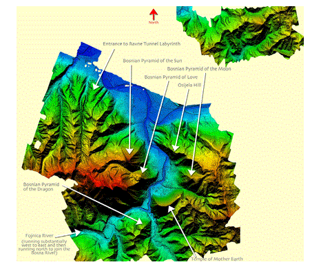 Figure 3: Topographic map of the Bosnian Valley of the Pyramids based on LiDAR elevation data. This visualization highlights major structures: the Bosnian Pyramid of the Sun, Moon, Love, and Dragon, the Temple of Mother Earth, Osijela Hill, and the entrance to the Ravne Tunnel Labyrinth. The Fojnica River is shown curving through the valley and flowing into the Bosna River. The LiDAR survey was conducted by Airborne Technologies GmbH (Austria), with topographic overlays and site identification by Richard Hoyle and Dr. Sam Osmanagich. Image adapted from the book Ravne 3 Tunnel (2022).