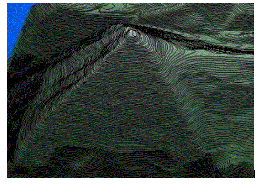 Figure 6: High-resolution elevation contour model of the Bosnian Pyramid of the Sun (BPS), produced by the State Institute for Geodesy of Bosnia-Herzegovina. The image reveals a near-perfect geometric shape with planar triangular faces and sharply defined edges. The northern face demonstrates precise orientation to true north, with a deviation of less than 0.2 degrees. This characteristic is a central feature in assessing astronomical alignment hypotheses. Map courtesy of the Geodetic Institute of Bosnia-Herzegovina.