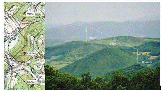 Figure 8: Map and photographic visualization of the linear alignment Moon–Earth–Dragon. Left: topographic map showing the alignment of the three summit points along a nearly perfect straight line. Right: photograph taken from the vantage point near the Pyramid of the Sun, showing the visual geometry of the three features as observed in the field. This linear arrangement is comparable in angle and proportion to alignments within the Pleiades star cluster. Image courtesy of the Archaeological Park Foundation, 2025.