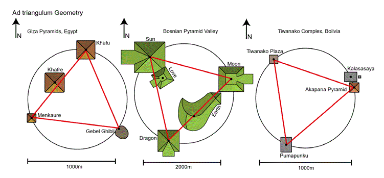 Figure 10: Comparative “ad triangulum” geometries observed in three pyramid and ceremonial complexes: Giza (Egypt), Bosnian Valley of the Pyramids (Bosnia-Herzegovina), and Tiwanaku (Bolivia). In each case, a triangular configuration links three principal features, inscribed within a circle and connected by red lines. The Bosnian configuration (Sun–Moon–Dragon) mirrors this ancient geometrical principle, suggesting a recurring pattern of spatial design across cultures. Graphic analysis adapted for scholarly purposes, 2025.