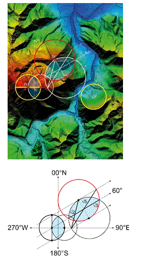 Figure 11: Vesica Piscis formation based on the summit points of the Bosnian Pyramid of the Sun and Pyramid of Love (left), and the hilltops of Krtnica and ÃÂ??etnica (right). The intersection zone forms a foundation for a Fibonacci spiral layout and exhibits angular divisions of 60°, √2, √3, and √5 ratios. This geometric structure connects multiple key points in the Bosnian Valley and introduces Krtnica and ÃÂ??etnica into the larger spatial logic. Their position and proximity also echo the outer stars of the Pleiades cluster—Pleione and Atlas