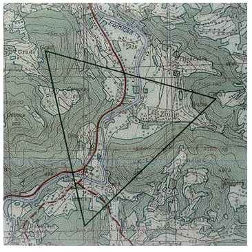 Figure 12: Equilateral triangle formed by the summit points of the Bosnian Pyramid of the Sun, Pyramid of the Moon, and Pyramid of the Dragon. The triangle is based on LiDAR-verified coordinates and cadastral overlays from the Municipal Office of Visoko. Each internal angle is close to 60°, and side lengths are approximately 2.2 kilometers, confirming precise triangular symmetry. This terrestrial geometry mirrors the stellar triangle of Maia–Electra–Merope in the Pleiades and serves as a reference for further geometric comparison.