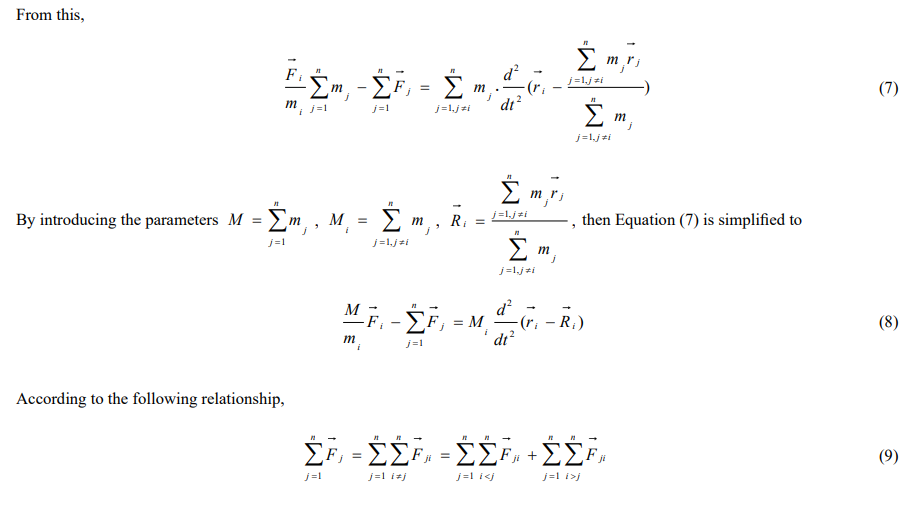 In view of the theoretical advantages of inertial frames in dynamic analysis, the expression of the gravitational resultant force of a celestial body mi in the center of mass inertial frame can be obtained by substituting Equation (19) into Equation (13)
