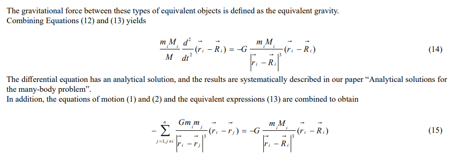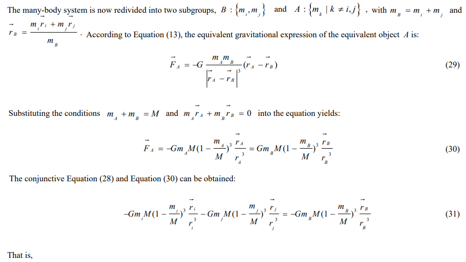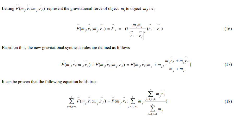 However, Equation (15) is based on the results of rigorous mathematical derivation based on Newton’s laws of motion and gravitation. If Newton’s system of mechanics itself is correct, and the law of gravity still applies in a many-body system, the physical interpretation of the equation must be revisited. In other words, it is necessary to introduce a new vector synthesis rule to ensure that the equation remains self-consistent for the modified theoretical framework. This paper proposes and formalizes the definition of this new gravitational synthesis rule.