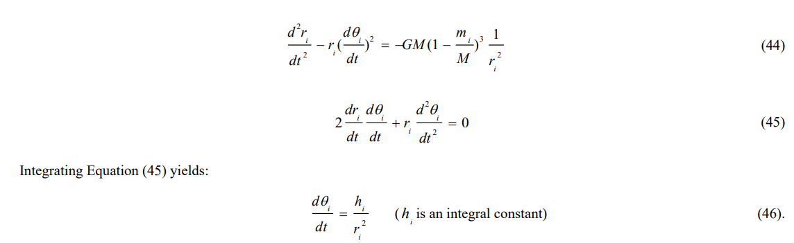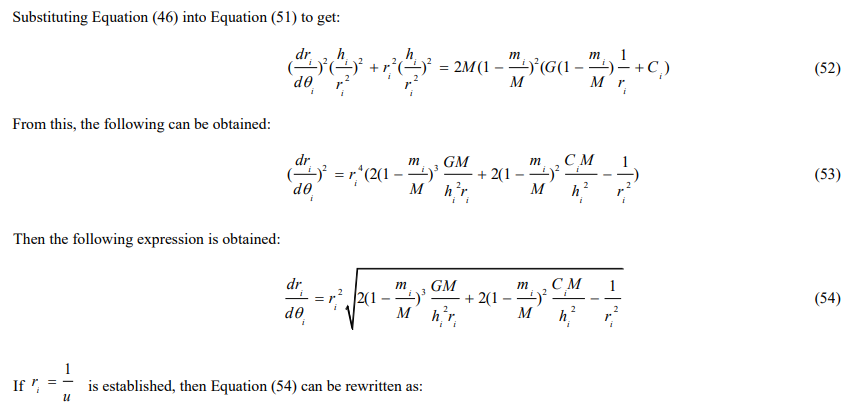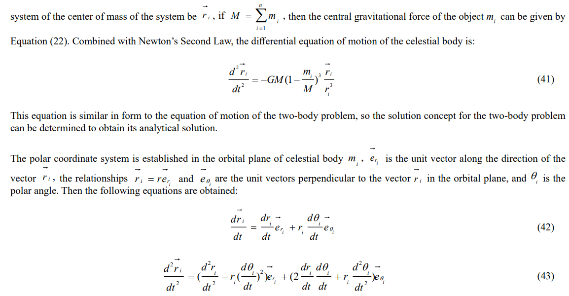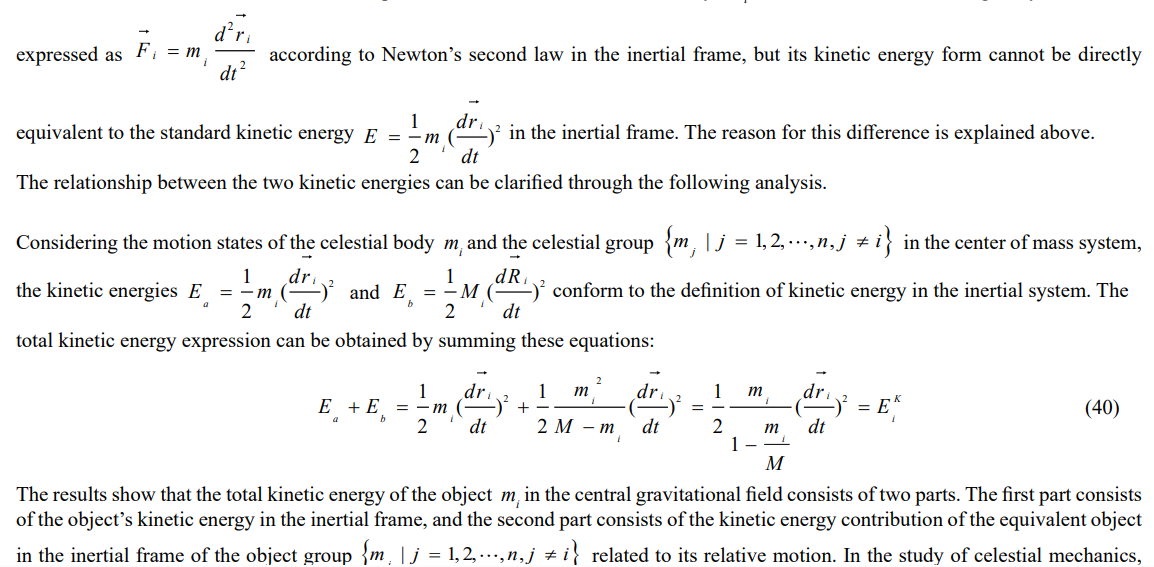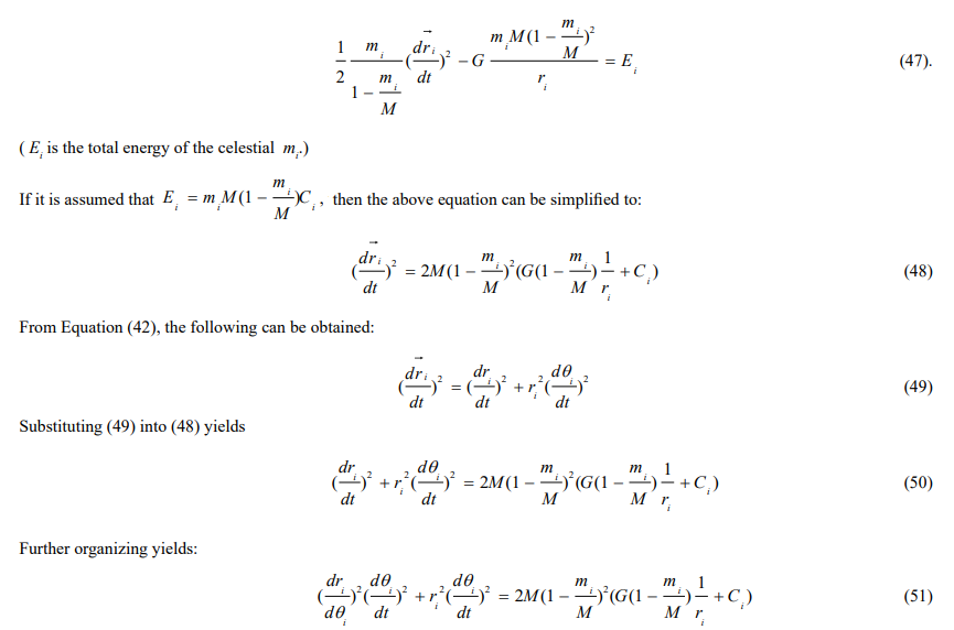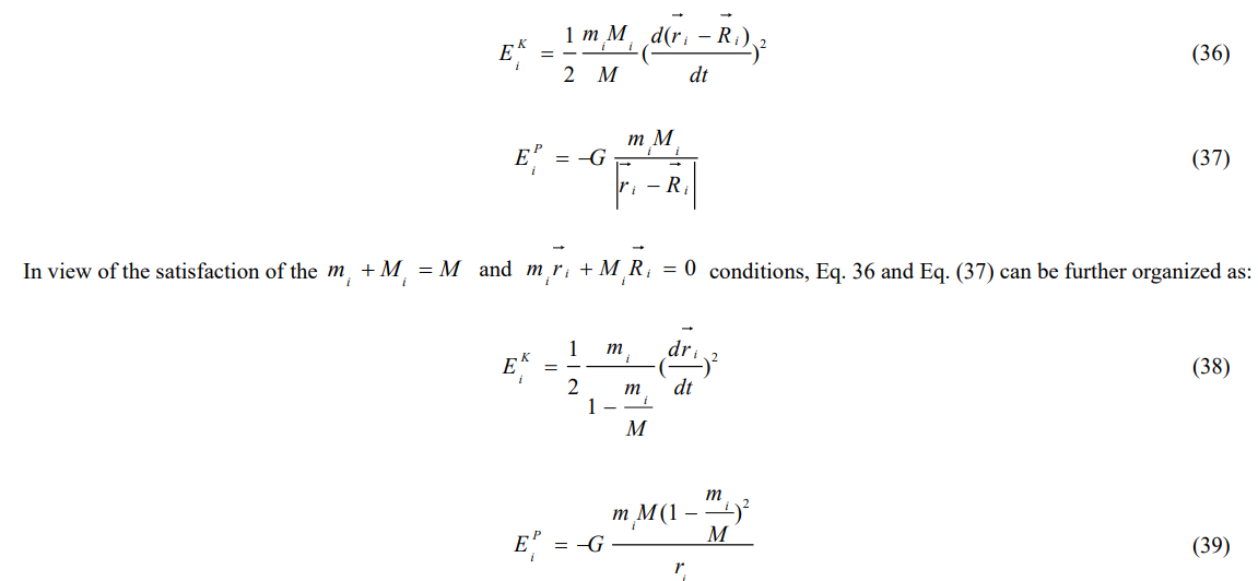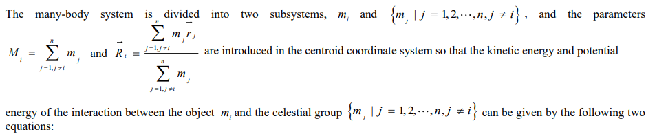 The kinetic energy of mi in the central gravitational field described in Equation (38) is defined as the total kinetic energy of the celestial body mi. Correspondingly, the potential energy of mi in the central gravitational field described in Equation (39) is defined as the total potential energy of the celestial body mi. This definition reflects the need for a systematic representation of energy in the centroid-of- mass inertial frame of reference.