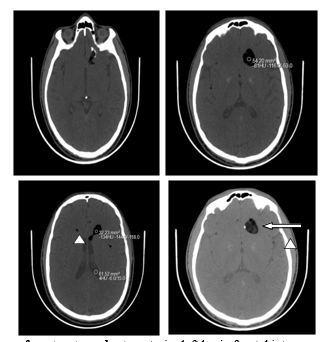 CT in axial sections without injection of contrast product : anterior left basi - frontal intra-parenchymal brain lesion , oval with finely heterogeneous fat density (white arrow) with calcified wall in places, ruptured in the ipsilateral lateral ventricle creating a liquid-fat level, with presence at the level of the subarachnoid spaces small droplets of fat density (arrowhead).