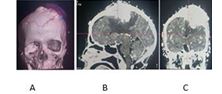 Figure 6(A to C:| 55 Years Male from white Nile, presented with History of scalp swelling, Rt side weakness and convulsions, intra- operative finding there was dilated scalp vessels (A), hence silk sutured was used for ligation, the bone was highly vascular and hyper osteotic, it was very difficult to be opened, the tumor was ill define capsule, resection was done.