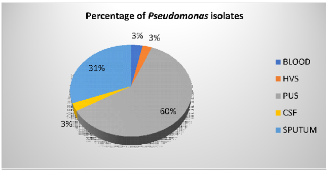 A total of 1888 Pseudomonas aeruginosa were isolated from the sample in which pus culture had 1138 (60%) isolates of Pseudomonas aeruginosa, followed by sputum culture 584 (31%), blood culture 63(3.3%), CSF 52 (3%) and the HVS 51 (3%) which are shown in Figure 2 and Table 1