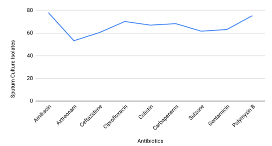 The above findings contrasted with the sensitivity found in this study, which involved amikacin (50.2%), ciprofloxacin (44.1%), gentamicin (35.4%), colistin (56.2%), and ceftazidime (34.1%), suggesting an increase in antibiotic resistance. Pseudomonas aeruginosa was found in 38% of sputum samples in a study conducted in Saudi Arabia in 2016 [18]. The Pseudomonas aeruginosa isolates from sputum samples were found to be 46.5% in a study conducted in Nepal. The same survey also showed Pseudomonas aeruginosa sensitivity patterns to standard antibiotics such as amikacin (91.5%), meropenem (78.5), ceftazidime (51.5%), and ciprofloxacin (69.50%) [19]. Comparatively, in this study, Pseudomonas aeruginosa in sputum culture has a positivity rate of 33%. The sensitivity pattern, however, was markedly reduced for amikacin (78%), meropenem (68.3%), ceftazidime (60.4%), and ciprofloxacin (70.2%). In accordance with the study done in Peshawar, the sensitivity of Pseudomonas aeruginosa isolates found in sputum samples towards antibiotics is amikacin (92.96%), meropenems (91.55%), ceftazidime (71.01%), ciprofloxacin (66.2%) and gentamicin (74.65%) in comparison to the sensitivity outcome in this study where for amikacin (78%), meropenem (68.3%), ceftazidime (60.4%) and ciprofloxacin (70.2%) showing a decreased effectiveness of Pseudomonas aeruginosa to these antibiotics [20].