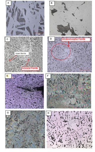 Figure 1: (A – H) The micrographs A through H show various areas from the low carbon steel that cooled in air upon break out during continuous casting. (B) shows more ferrite and a film of cementite (white) around the pearlite. The rest of the micrographs (C through H) show typical as-cast microstructures at various stages of solidification; the dendrites of the columnar zone (F and G), acicular ferrites (C), polygonal ferrites and alotromorphic ferrite (H).