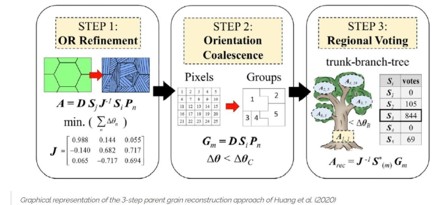 For either case the theory behind their (OR) computation has evolved from solving rigorous manual mathematical Rotation Matrices as detailed in Bhadeshia to the use of digital computational analysis. In their work, Cheng-Yao Huang et. al. devised a 3-step process (see Fig. 2) for parent grain reconstruction involving (i) the refinement of the orientation relationship, (ii) Orientation Coalescence and (iii) a voting process [13-16]. These steps are really better described by the authors than we could. They depicted the said processes graphically as hereunder: