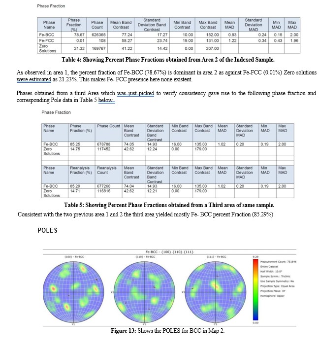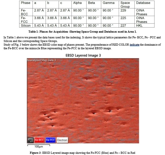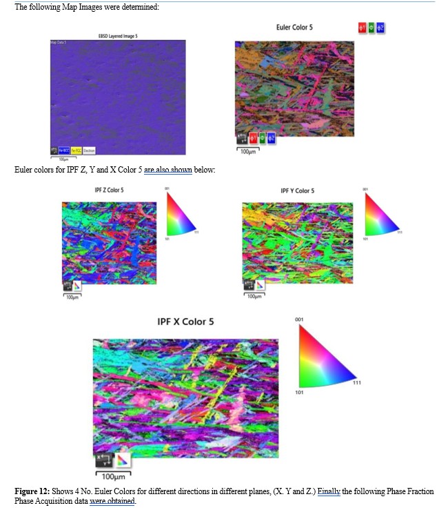 SEM and EBSD data were obtained at the The McCrone Group laboratory. For the scanning electron microscopy (SEM) imaging, EBSD and X-ray spectroscopy (EDS) analyses, samples were prepared using standard grinding and polishing procedures. The mechanically polished surface was etched in Nital-2% concentrated HNO3 in ethanol for a few seconds for SEM. Each sample was further polished using the Leica TIC3X triple ion beam polisher. Even though the polish was considered good it still had about 15% zero solutions. That is areas producing no patterns or unindexable patterns, which were likely due to variations in the surface finish. The SEM equipment was set at Accelerating Voltage of 20.22Kv; Specimen Tilt (degree) of 70.00; Hit Rate of 78.88% and Speed of Acquisition set at 40.32Hz.