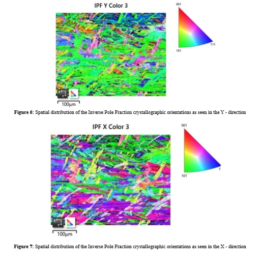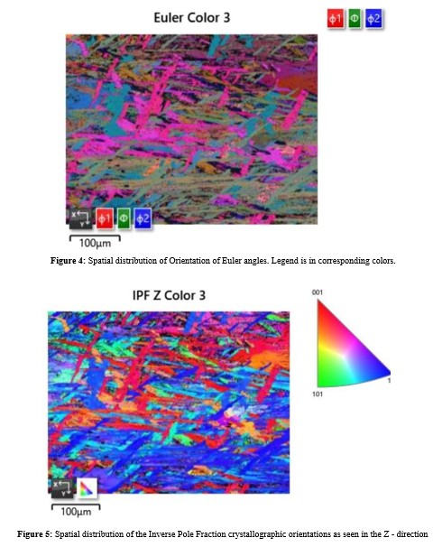 Figures 4 through 6 below show color spatial distribution of Euler angles in both Pole fractions or Inverted Pole Fractions as indicated below each figure. For each figure there is an accompaning color legend for ease of understanding.