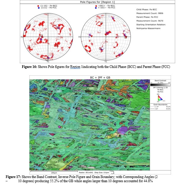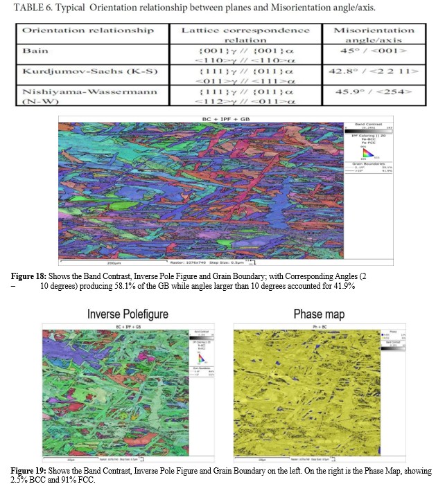 An attempt was made to reconstruct the parent phase from the BCC data obtained in this study using the Aztec Crystal software. The austenite grain has a specific orientation relationship with the ferrite matrix derived from it. Grains that have been formed by a α - γ or vice-versa phase transformation should show a Bain, Nishiyama - Wassermann (N-W), or Kurdjumov-Sachs (K-S) orientation relationship. These orientation relationships can be described as a rotation of an angle Ф about a common crystallographic axis (axis of rotation). This angle and axis are known as the angle/axis pair. Table 1 shows typical Orientation relationships between austenite (γ) and ferrite (α) matrix.
