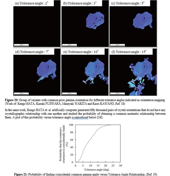 In their work Kengo HATA reported that when the tolerance angle was set at 2 degrees (Fig. 20(a) below), the analysis failed to discover any common austenite orientation with adjacent variants. Therefore, no grain is shown in the figure. This is because the tolerance angle is set too low to discover a common austenite orientation. When the tolerance angles are 3 degrees or above, martensite variants having a common austenite  orientation were discovered. They further reported that its region expanded greatly as the tolerance angle is increased. These results clearly indicate that the analysis of common austenite grains can vary depending on the tolerance angle. The group of plots shown below (Fig. 20) are taken from the work of Kengo HATA et al. for clarity.