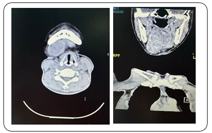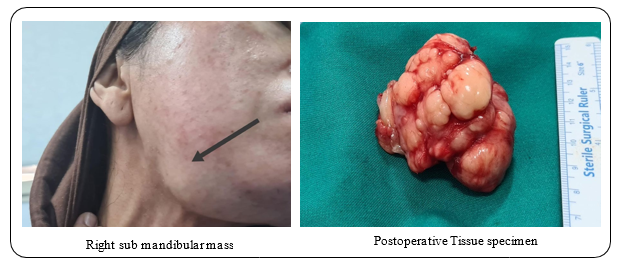 A 43-year-old female patient, previously healthy, presented to the out-patient clinic with 4 months history of right sub-lingual swell- ing, that gradually increase in size. Associated with restriction in opening the mouth. On physical examination, she was conscious, alert, and fully oriented. Her vital signs were within normal range. She had right sub-lingual swelling, which is about 5x5x2 cm in size. The facial sensation was intact. No palpable lymph nodes in cervical and auricular region. Laboratory studies showed white count level of 6.7x109 /L , a hemoglobin level of 120 g/L, creat- inine level of 47 mmol/ L, sodium of 134 mmol/L and potassium of 3.7 mmol/L. CT Neck was done and showed A sizable mass lesion is seen involving the right sublingual and submandibular spaces (right side of floor of the mouth), showing the following CT criteria: It is seen located just anterior to the right submandibular gland, displacing it posteriorly, however being inseparable from it at a certain point within its superior part with suggested areas of glandular invasion. There is prime involvement of the right sublin- gual space with infiltrative medial border, medially displacing and being inseparable from the right genioglossus muscle. Inferiorly, it extends medially involving and towards the midline displacing the right anterior belly of digastric muscle with no separable cleavage plane. There is encroachment upon the right anterolateral aspect of the oropharynx, which appears relatively narrowed. It is measur- ing about 5 x 5 x 2.5 cm in maximum AP, CC & TR dimensions. It shows heterogeneous pattern of contrast enhancement pattern with multiple internal cystic-like areas, denoting internal braking down/ degenerative necrosis. The right body of the mandible presents fo- cal area of inner cortical rarefaction with suspected altered-tex- tured lytic intra-medullary involvement.