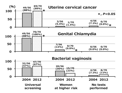 Methods: The number of obstetric care facilities in Hokkaido was 113 in 2004 and 97 in 2012. We conducted an anonymous survey on universal screening for UCC, genital CT, and BV and compared the results of the 2004 and 2012 surveys. Our questionnaires in 2004 and 2012 were similar with the exception of the questions about timing of genital CT and BV screenings and diagnostic methods for BV in 2012.