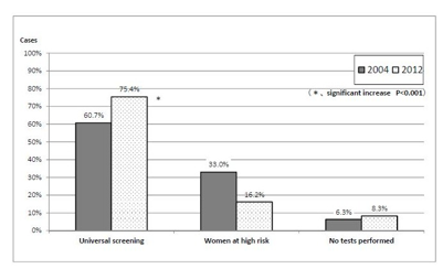 The number of facilities that adopted the universal screening for BV increased between 2004 and 2012, but not significantly. However, the number of the cases undergoing universal screening for BV significantly increased between the two periods.