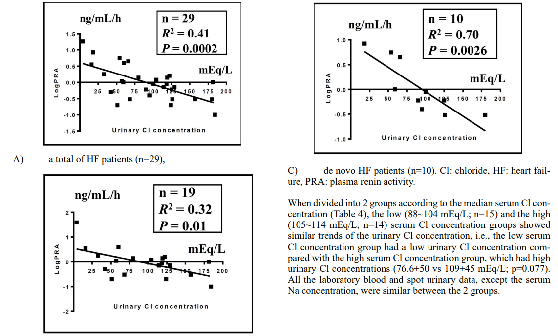 Many experimental studies have demonstrated the central role of urinary Cl in the ‘tubulo-glomerular feedback’ mechanism, through which absorption and excretion of urinary electrolytes and water along the urinary tubules are integrated for maintaining body fluid dynamics [1-4]. It remains unclear, however, whether the urinary Cl concentration regulates PRA in clinical HF patho- physiology of human body. Although the urine content, including electrolyte Cl, should be modified by the process of glomerular filtration of plasma running through the renal tubules to the blad- der, the present study revealed a modest correlation between the spot urinary Cl concentration and PRA (Figure 1), confirming the possible functioning of ‘tubulo-glomerular feedback’ in the human body. Indeed, the scatter plot of individual HF patients in the pres-ent study shown in Figure 1 is consistent with the findings reported by He et al, in which the relationship between the macula densa Cl concentration and renin secretion was evaluated in an isolated per- fused rabbit juxtaglomerular apparatus preparation [3]. Of course, the Cl concentration in the urine coming into the macula densa is not the only factor affecting the release of plasma renin.