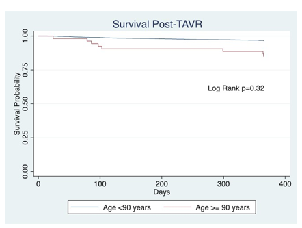 Methods: Using Cox proportional hazards method, we retrospectively analyzed 1246 patients age > 50 years undergoing TAVR at our institution from the STS/ACC TVT database between 2010-2020. Patients age > 90 were compared with younger patients with coprimary endpoints of inpatient mortality and major bleeding requiring transfusion, 1-yr mortality, and 30-day all cause readmission.