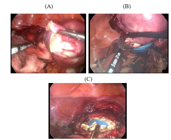 During surgery, 10 mm laparoscope and advanced bipolar energy modalities were used. Including umbilicus 3 laparoscopic trocar were inserted. First, 10 mm trocar was inserted directly in 1 cm incision which was on sub umbilical area. The laparoscope was placed in abdomen after 3-4 L CO2 insufflation into the abdominal cavity. Second and third incisions were made on avascular right and left lower abdomen and two 5 mm trocars were placed in the abdomen.