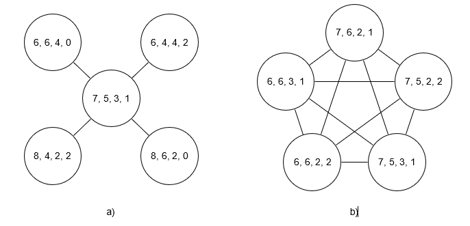 Example 1. Two graphs for TPF(16, 4) with 5 nodes are depicted on Fig. 1: a star and a perfect graph. Fig. 1a shows the partition graph which contains the internal node, (7, 5, 3, 1) ≡ α, and four leaves, (6, 6, 4, 0), (6, 4, 4, 2), (8, 4, 2, 2), (8, 6, 2, 0). Any star have minimized the social cost G(S) when cost of edge equals 3 [8]. Suppose that for some reasons the label of the internal node is changed to (6, 6, 2, 2) ≡ β. Note that ρ(α, β) = 1 and total resource of these nodes doesn’t change, i.e. it makes sense to consider this change insignificant. However, the star in Fig. 1a turns into four isolated nodes (for formation game it can be treated as if the players preferred not to cooperate)2. If partitions at all leaves of the star could be change in a different, but also insignificant way (see Fig. 1b), the star graph would be transformed into a complete graph, i.e. another optimal social cost decision although cost of edge doesn’t change. This example demonstrates that labels of graph nodes define the topological structure of a network graph in first place.