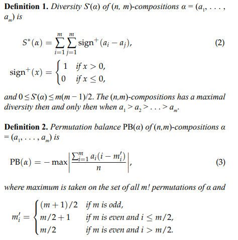 An (n, m)-partition of n into no more than m parts is defined as a sequence of nonnegative integers a1 ≥ a2 ≥ ... ≥ ak ≥ 0, such that n = a1 + a2 + ... + am. The set of all feasible (n, m)-partitions is denoted by P(n, m).