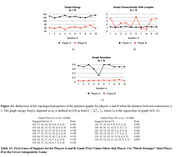 Importantly, the partition’s features used in the selection mechanism should be easily computed (the time complexity should be no more than quadratic in the resource value). Attempts to estimate the efficiency of the selection mechanisms in Blotto (Lotto) games were made in and [17, 18]. In [17] the strategy efficiency is defined as the result of some kind of evolutionary game. The numerical simulation demonstrated that the class with strategies containing a large diversity and a large permutation balance is certain to be an “absolute evolution winner”, i.e., the strategies from this class are winners in all evolutionary experiments. Now, we will study the topological structure graphs that are used in the Blotto game. Let P∗(n, m) ∈ P(n, m) be the set of suboptimal strategies in Blotto (n, m)-partition games [18], and Prand(n, m) ∈ P(n, m) be a set of random strategies with |Prand(n, m)| = |P∗(n, m)|. It is found that the topological properties of the graphs with nodes labeled with P∗(n, m) and Prand(n, m) are essentially different. Almost all graphs that are designed from random strategies have small densities and energy values. As a result, a graph with small energy (density) essentially does not have a chance to win against a graph with more energy (density). Therefore, game equilibrium assumes that the graphs of the playing strategies of both players are strongly connected. This is circumstantial (but encouraging) evidence that within the network design and its behavior (functionalities) are deep and insufficiently studied relationships. Although this fact may seem selfevident from a commonsense point of view, to the best of our knowledge, this study is the first to provide a set of detailed experimental results. am) is