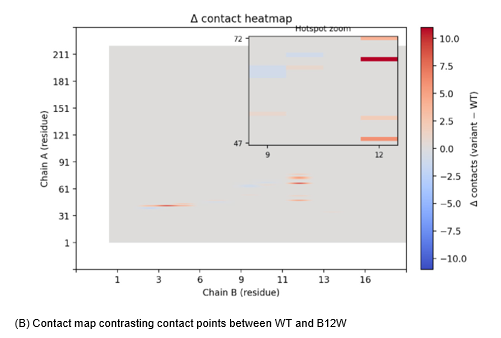 Figure 5: Effects of Binder Mutations on Interface Contacts. (A) Wild-type vs. B10K contact maps: The residue contact matrix for variant B10K (right) is virtually identical to the wild-type binder (left), indicating that introducing a Lys at binder position 10 does not substantially alter the interface contacts with CLDN6. No new salt bridge or electrostatic interaction was observed; the variant maintains the original binding mode.