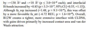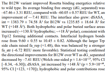 The final binder was validated in silico with AlphaFold3, which predicted a well-structured CLDN6–binder complex (interface TM-score ≈ 0.73). Rosetta InterfaceAnalyzer predicted a binding free energy of –60 REU and a buried surface area of ~1200 Å2, values comparable to those of antibody–antigen complexes. Computational alanine scanning identified a cluster of key interface residues (B9–B12) that contributed most to binding. We performed in silico saturation mutagenesis and discovered that a tryptophan substitution at B12 (B12W) enhanced predicted binding energy by ~7.4 REU, increased buried surface area by +129 Å2, and strengthened hydrogen bonding by +0.85 bonds (p < 0.01).