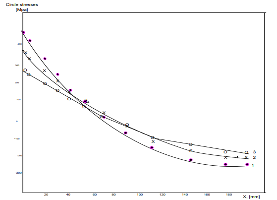 Figure 8: Relative Stress Distribution as a Function of the Distance X from the Boundary of the Overlay with the Base Metal. (X = 0 e position closest to the inner surface of the Reactor vessel. The current loads have maximum values). Curve 1 - currently 0,2 hours from the time interval of the “Big Primary Leak” mode; Curve 2 at 0.4 hours; Curve 3 at 0.6 hours