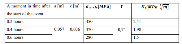 Using formula (1) are calculated the values of the stress intensity coefficients KI at three different points in time after the start of the “Big Primary Leak” mode, Table 2.