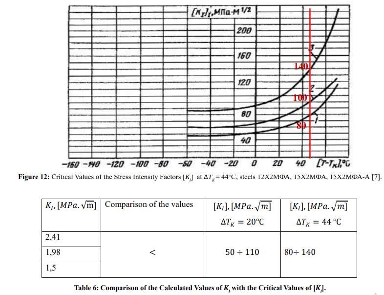 The defects detected by visual inspection have stress intensity factors KI , much smaller than the critical factors [KI]. Any analysis in nuclear energy should be done using a conservative approach. This means that the most unfavorable values should be considered in the calculations. In this particular case, this approach was followed at the following stages of the analyses: Critical temperature values are taken ΔTK (F,t) = 44ºC which is twice as high as the value obtained from the witness samples ΔTK (F,t) = 20 ºC). The confirmation of the model is the calculated critical values of [KI] coincide with the range of values defined in the strength norms [7]. This article discusses only three mechanisms of base metal degradation neutron and thermal aging and embrittlement due to surface defects. The mechanisms of material fatigue degradation, fatigue, as well as the chemical processes of surface corrosion are not considered.