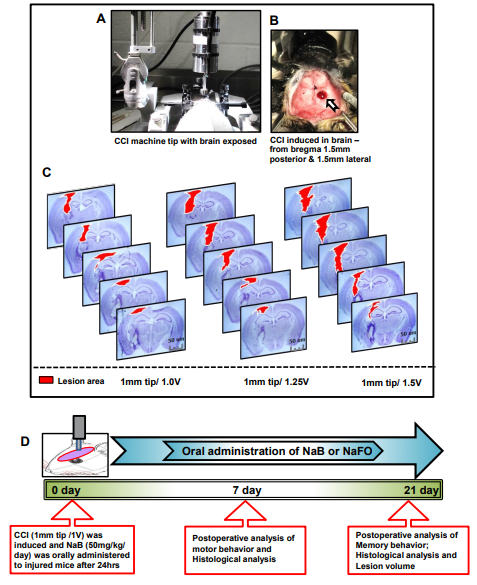 Figure 1D shows the experimental design used in this study. All mice were randomized into the following groups: Group 1: Control/Sham group (n=6 per group): Mice underwent surgery without any injury and treatment. Group 2: CCI group (n=6 per group): Mice underwent CCI injury and no treatment was carried out. Group 3: CCI+NaB treatment (n=6 per group): Mice were subjected to CCI and NaB (50 mg/kg/day) treatment orally was started 24 hours after the induction of injury. Group 4: CCI+NaFO treatment (n=6 per group). Mice were subjected to brain injury and NaFO (50 mg/kg/day) treatment orally was started 24 hours after the induction of injury.
