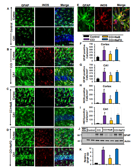 Figure 2: Oral treatment of NaB attenuates the activation of astrocytes in vivo in the cortex and hippocampus region of mice with CCI injury. Mice were treated with 50 mg/kg/day of NaB or NaFO via oral administration after the induction of CCI injury. After 7 days of NaB treatment, brain sections were analyzed by double-label immunofluorescence for GFAP and iNOS (A, control; B, CCI injury; C, CCI+NaB; D, CCI+NaFO). (E) Confocal image demonstrating the co-localization of iNOS and GFAP in the cortex. Cells positive for GFAP were counted in the cortex (F) and CA1 region (G). Subsequently, iNOS-positive cells were also counted in the cortexand CA1 region (I). Results represent analysis of six sections of six mice each per group. a p < 0.001 vs. control; b p < 0.001 vs. CCI injury. Tissue extracts of hippocampal region from all groups of mice (n = 4 per group) were immunoblotted for GFAP (J). Actin was run as a loading control. (K) Bands were scanned, and values (GFAP/Actin) are presented as relative to control. a p < 0.001 vs. control; b p < 0.001 vs. CCI injury.