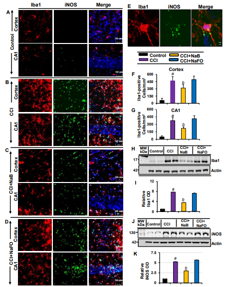 These findings were confirmed by quantitative analyses (Figure 2H-I) and Western blotting (Figure 3J- K). Collectively, these results denote that NaB is capable of reducing glial inflammation in vivo in the CNS of CCI-induced TBI mice.