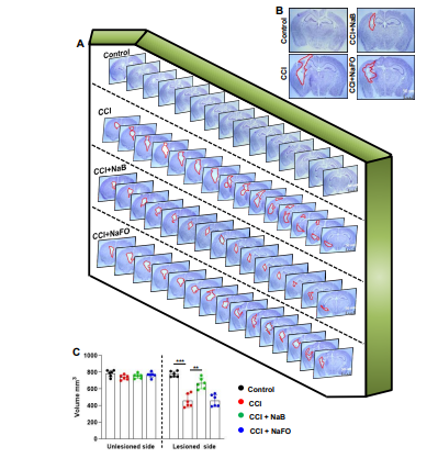 Figure 4: NaB treatment reduces the lesion volume in mice with CCI injury. (A) Representative cresyl violet sections of mouse brain arranged in series of the hippocampal region show the volume of the lesion cavity in different groups. (B) Illustrative images of cresyl violet sections are shown. Note the extent of damage induced in the brain was found to be reduced in NaB-treated mice when compared to CCI mice without treatment and NaFO-treated CCI injury mice. (C) Lesion size was quantitatively measured in control mice, untreated CCI-injured mice, NaB-treated CCI mice and NaFO-treated CCI mice at 21 days post-injury. Statistical analyses were performed with two-way ANOVA and are expressed as mean ± SD to compare the lesion volume 27 between unlesioned and lesioned sides of the brain, as [F1,20 = 156.60 (*** p < 0.0001] control vs. CCI, and [F3,20 = 30.23 (** p < 0.001) CCI vs. CCI+NaB treatment, respectively.