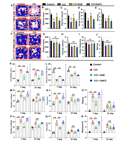 However, upon treatment with NaB, but not NaFO, CCI-injured mice demonstrated significant improvement in gait movement on the beam (Figure 5M-O) and grid runways (Figure 5P-R). NaB-treated CCI mice also exhibited a significant upgrade in latency, footsteps, foot slips and foot misplacement as compared to either untreated or NaFO-treated CCI mice (Figure 5M- R). On the other hand, at 21 days post-injury, CCI mice recovered considerably to the near-normal level as we did not see significant changes in these parameters with respect to sham controls. As a result, NaB treatment also did not display significant protection either in beam walking (Figure 5M-O) or on grid runways (Figure 5P-R) in CCI mice at 21 days post-injury.