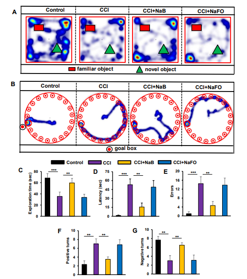Figure 6: Effect of NaB treatment on spatial learning and memory in mice with CCI-injury. Mice were treated with NaB or NaFO orally (50 mg/kg/day) from 24 h after the induction of CCI injury. Following 21 days of treatment, mice were tested by the novel object recognition test (A, heat map; C, exploration time), Barnes maze (B, heat map; D, time taken; E, number of errors) and T-maze (F, positive turns; G, negative turns). Six mice were used in each group. Statistical analyses were performed by one-way ANOVA followed by Tukey’s post hoc test for the novel object recognition test (exploration time: (*** p < 0.0001) vs. control; (** p < 0.0099) vs. CCI injury); Barnes maze test (time taken: (*** p < 0.0002) vs. control; (** p < 0.0014) vs. CCI injury, and number of errors: (*** p < 0.0006) vs. control; (** p < 0.0012) vs. CCI injury); and T-maze (positive turns: (** p < 0.0063) vs. control; (** p < 0.0035) vs. CCI injury, and negative turns: (** p < 0.0064) vs. control; (** p < 0.0035) vs. CCI injury).