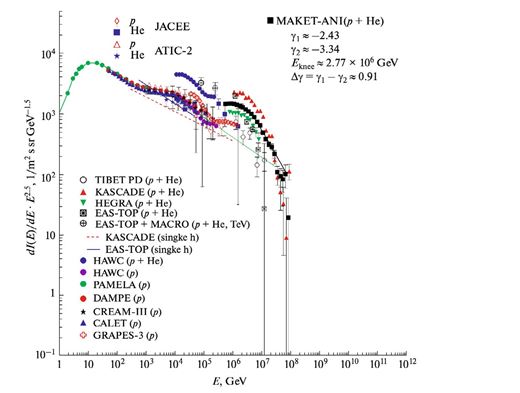 Figure 1: Primary light nuclei (p+He) spectra measured by the MAKET-ANI detector in comparison with the spectra reported by KASCADE, EAS-TOP, HEGRA, EAS- TOP+MACRO, TIBET experiments (all spectra were obtained with CORSIKA QGSJet01model) [11]. The direct balloon measurements by ATIC-2 and JACEE are related to 102 - 105 GeV energies. The modern experiments HAWC, PAMELA, DAMPE, CREAM I-III, CALET, and GRAPES-3 are included as well [15-20].
