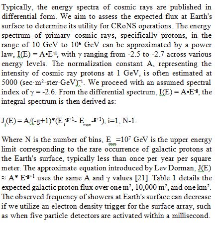Typically, the energy spectra of cosmic rays are published in differential form. We aim to assess the expected flux at Earth's surface to determine its utility for CRoNS operations. The energy spectrum of primary cosmic rays, specifically protons, in the range of 10 GeV to 10â¶ GeV can be approximated by a power law, I(E) = A•E-g, with γ ranging from -2.5 to -2.7 across various energy levels. The normalization constant A, representing the intensity of cosmic ray protons at 1 GeV, is often estimated at 5000 (sec•m²•ster•GeV)⻹. We proceed with an assumed spectral index of γ = -2.6. From the differential spectrum, I(E) = A•E-g, the integral spectrum is then derived as: