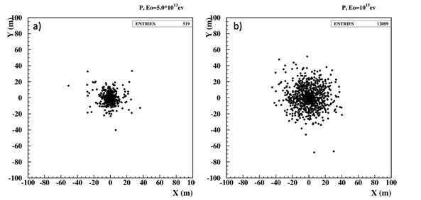 Figure 2: The Distribution of Muons Hitting the Ground from the Low-Energy Primary Proton, 10 TeV, a) and 1000 TeV, b).