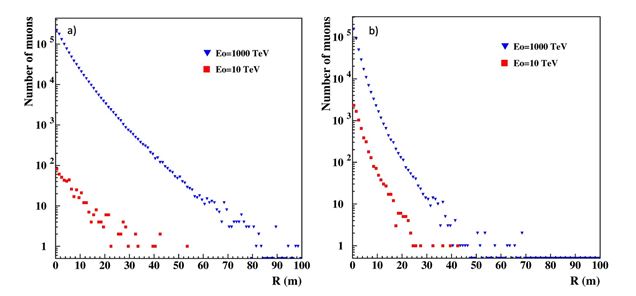 Figure 3: The Lateral Distribution of Muons with Energies above 10 MeV from Primary Protons with Energies 1000 TeV, blue, and 10 TeV, red. One hundred showers for each primary energy were simulated. a) on the Earth’s surface; b) under 15 m of soil and concrete (minimal energy of muons 5 GeV).